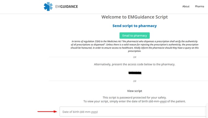 After opening the link, you will be asked to enter your date of birth (DOB) to proceed to the script preview. Alternatively, you may choose to click the green "Email to pharmacy" button, which will prompt a search for nearby pharmacies. Simply select your preferred pharmacy and then click the "Confirm and Send" button to continue.