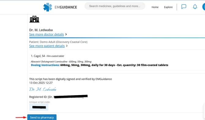 To complete the process, click the blue "Confirm and send" button to submit your script to the selected pharmacy. For a step-by-step overview, please refer to the patient support PDF, available here.