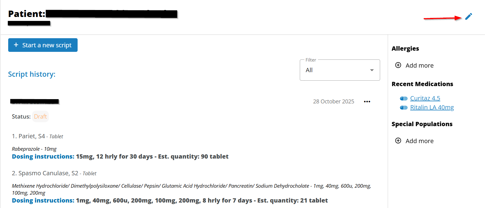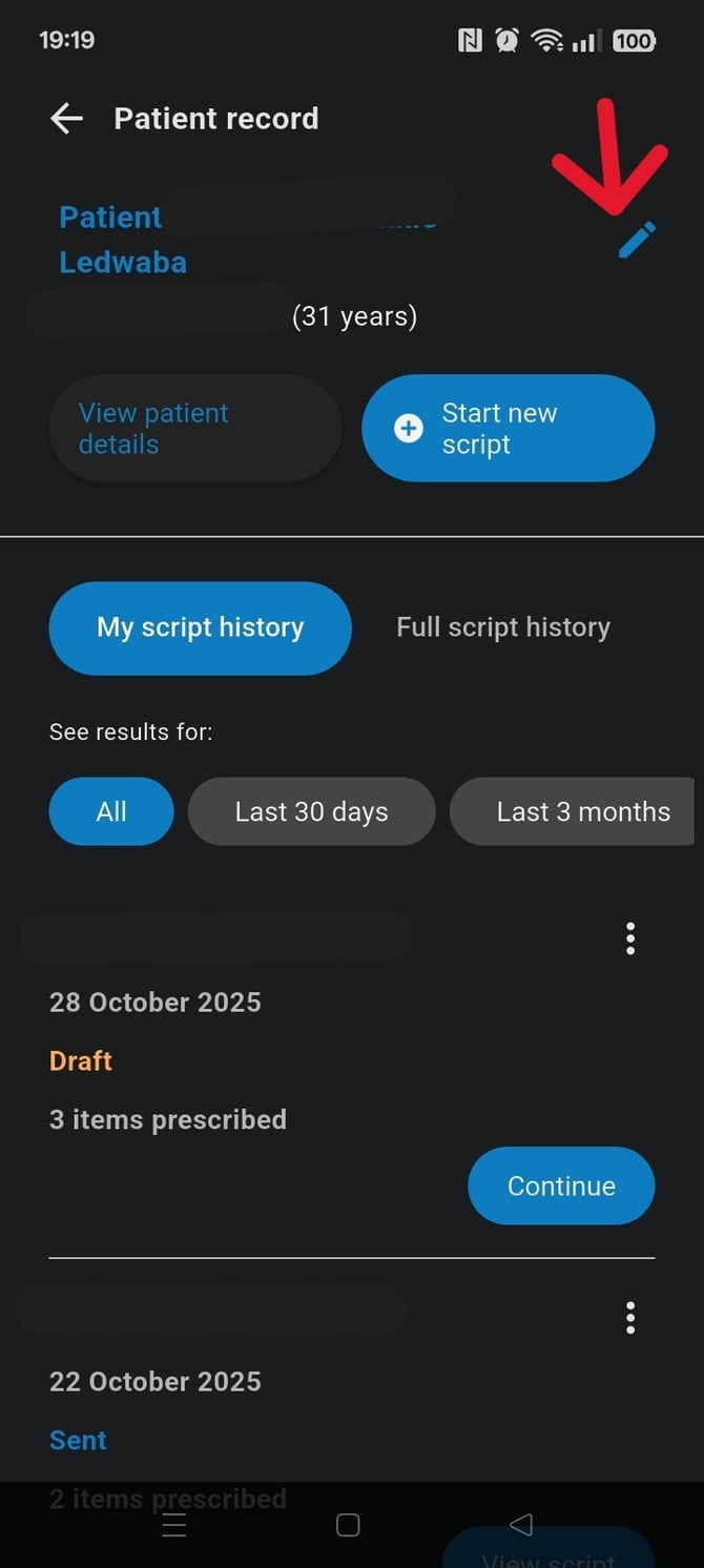 6. Click the “View profile” option next to the blue “Start script” button. The patient’s script history will open. In the top-right corner, click the blue pen/pencil icon to open and edit the profile fields.
