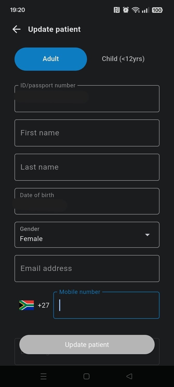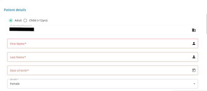 - During patient profile creation, the following fields are mandatory (ID Number/Passport, First Name, Last Name, Date of Birth, Gender, the type of address, address line 1 and the City). All these fields are editable except for the ID Number/ Passport field.