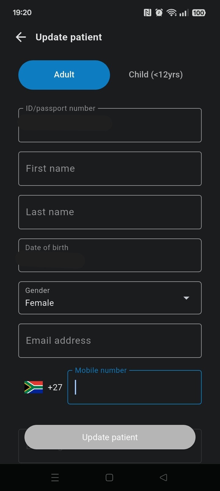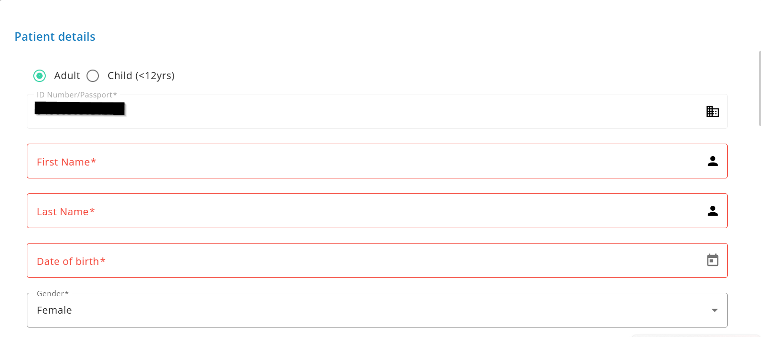 - During patient profile creation,the following fields are mandatory (ID Number/Passport, First Name, Last Name, Date of Birth, Gender, the type of address, address line 1 and the City). All these fields are editable except for the ID Number/ Passport field.