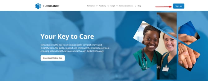 1. In a new browser tab, search for “EMGuidance” or navigate directly to the EMGuidance website. On the homepage, click the blue “Sign up” button located in the top-right corner of the screen.