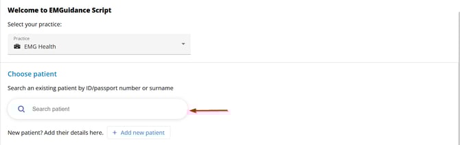 - To locate a patient within EMGuidance Script, begin by searching using the patient’s full name,last name, South African Identity Number (ID) or, for foreign nationals, their passport number. If the patient already has an EMGuidance Script profile, their details will appear in the search results.
