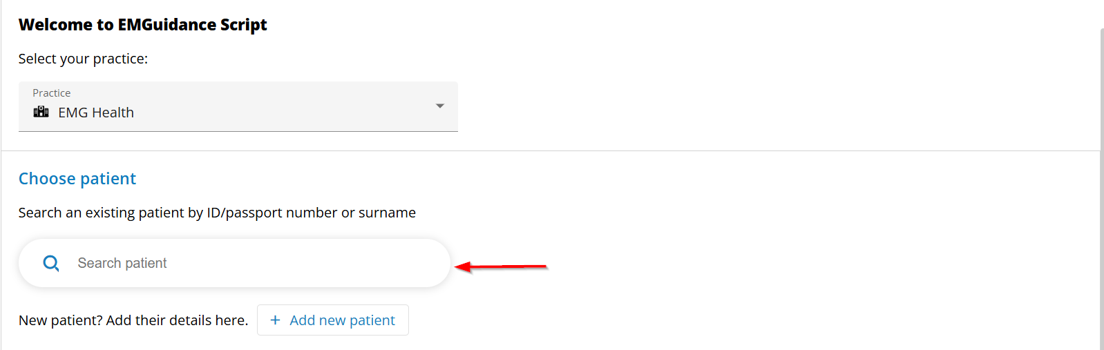 - To locate a patient within EMGuidance Script, begin by searching using the patient’s full name/last name or South African Identity Number (ID) or, for foreign nationals, their passport number. If the patient already has an EMGuidance Script profile, their details will appear in the search results.