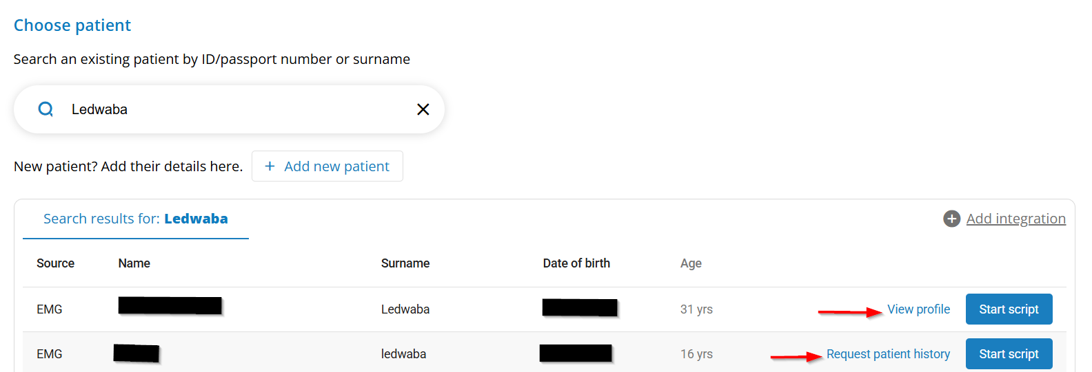 2. You will be redirected to the script home page. Where you will be able to search the patients profile by using their surname or ID number/passport.